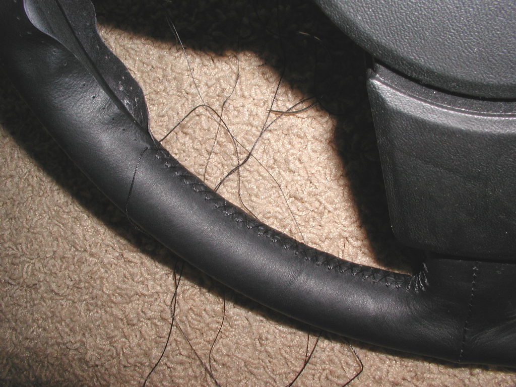 | This wheel has the thicker grip, so it will mean more careful adjustment and slight stretching of the leather to make it fit properly. It might not be highly visible in this picture, but I did some temporary stitches at the spokes and on the rim to try and better position the leather. | |